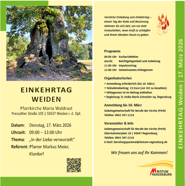 Es ergeht herzliche Einladung an alle Interessierten zum EINKEHRTAG AM VORMITTAG der Gebetsgemeinschaft für Berufe der Kirche (PWB) in WEIDEN, Pfarrkirche Maria Waldrast, Pressather Str. 105, 92637 Weiden