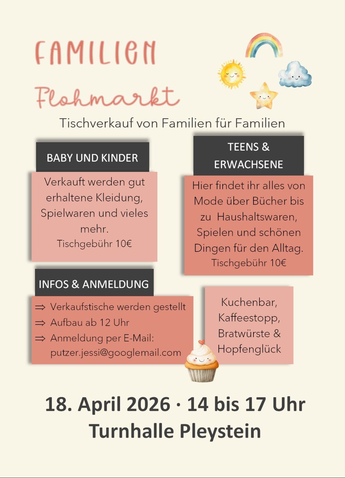 Der Elternbeirat vom Kindergarten St. Elisabeth veranstaltet dieses Jahr zum ersten Mal einen Familienflohmarkt am 18.04.2026 von 14 Uhr - 17 Uhr in der Turnhalle Pleystein.