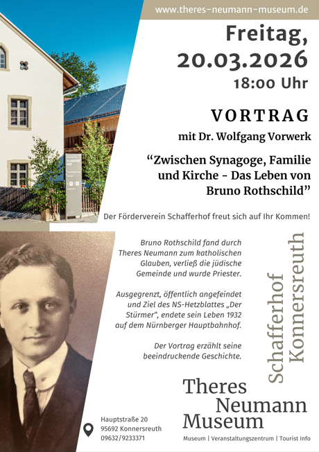 Am Freitag, 20. März 2026, findet um 18.00 Uhr im Theres-Neumann-Museum in Konnersreuth ein Vortrag mit Wolfgang Vorwerk statt. Unter dem Titel „Zwischen Synagoge, Familie und Kirche – Das Leben von Bruno Rothschild“ wird dessen bewegte Lebensgeschichte vorgestellt. Rothschild fand durch Therese Neumann zum katholischen Glauben und wurde später Priester. Veranstalter ist der Förderverein Schafferhof. Interessierte sind herzlich eingeladen.