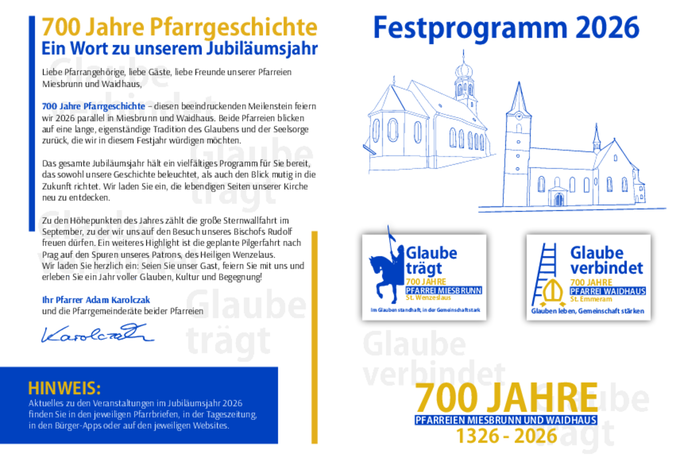 700 Jahre Pfarrgeschichte – diesen beeindruckenden Meilenstein feiern wir 2026 parallel in Miesbrunn und Waidhaus. Beide Pfarreien blicken auf eine lange, eigenständige Tradition des Glaubens und der Seelsorge zurück, die wir in diesem Festjahr würdigen möchten.