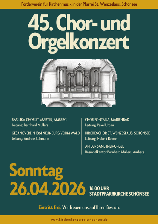 Am Sonntag, 26. April 2026, erwartet die Besucher um 16:00 Uhr in der Stadtpfarrkirche Schönsee ein abwechslungsreiches musikalisches Programm mit mehreren Chören aus der Region und darüber hinaus. Mitwirkende sind der Basilika-Chor St. Martin Amberg (Leitung: Bernhard Müllers), der Gesangverein 1861 Neunburg vorm Wald (Leitung: Andreas Lehmann), der Chor Fontana aus Marienbad (Leitung: Pavel Urban) sowie der Kirchenchor St. Wenzeslaus Schönsee (Leitung: Hubert Reimer).