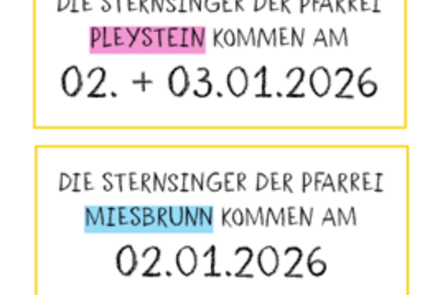 Anfang Januar ziehen unsere Sternsinger wieder von Haus zu Haus, um Ihnen den Segen Gottes für das neue Jahr zu bringen. In unseren Pfarreien wird das an den folgenden Tagen sein:Pleystein: Freitag, 02.01. und Samstag, 03.01.Burkhardsrieth: Sonntag, 04.01.Miesbrunn: Freitag, 02.01.Waidhaus: Freitag, 02.01.Das Motto der Aktion Dreikönigssingen 2026 lautet: Schule statt Fabrik! Sternsingen gegen Kinderarbeit. Bei ihrem Besuch bitten unsere Sternsinger um Ihre Unterstützung für Kinderhilfsprojekte in Afrika, Asien, Lateinamerika, Ozeanien und Osteuropa.Bitte nehmen sie unsere Sternsinger freundlich auf.